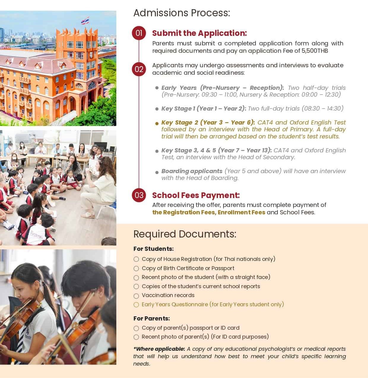 “Our admissions process begins with a school visit, followed by submission of an application form, and then scheduling an assessment or trial for your child. School tours are typically conducted by our dedicated Admissions team, the Head of Primary, or the Head of Secondary School.